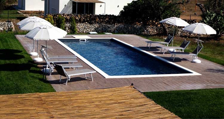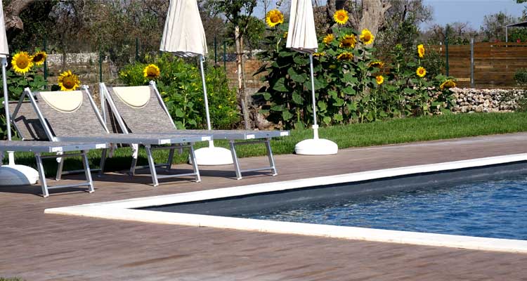 A 12 (40 feet) by 4 (13 feet) metre pool. It is 1 metre and 40 centimetres (4 feet) deep with an innovative filtration system that allows a reduced use of chlorine. The colouring is an intense blue reflecting the colours of the sky and the countryside. Use of the pool is reserved only for guests of the agriturismo, 10 people maximum. A corner of peace and silence appreciated especially during the weeks when the crowds storm the beaches of Salento. Two sunbeds under a parasol for each room. By the pool a shower with hot water heated by the sun.